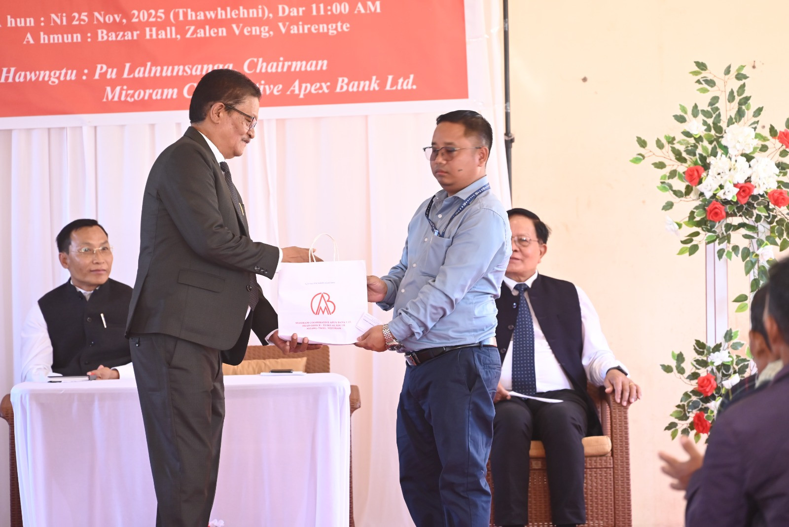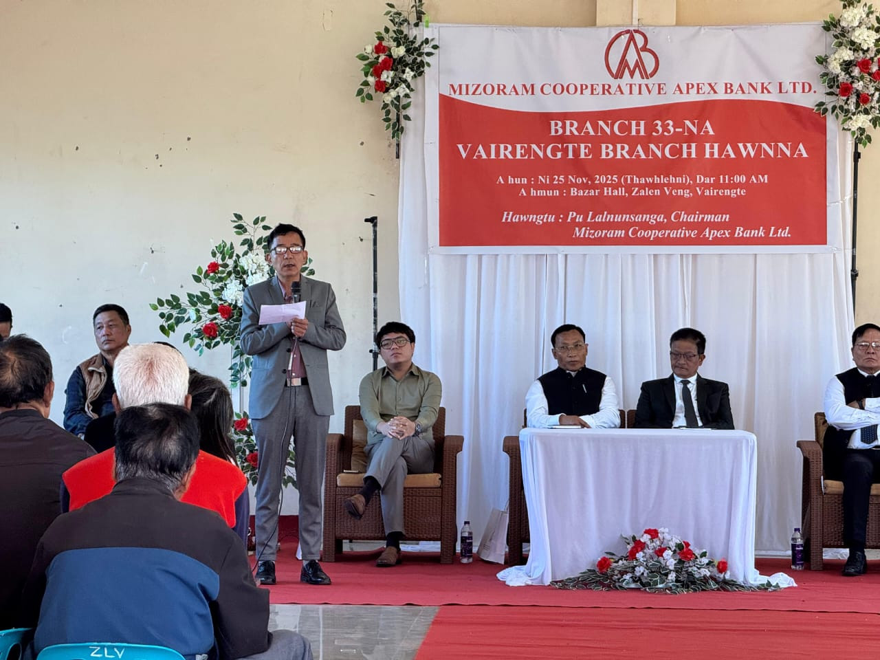 Vairengte, the 25th November, 2025: Vawiin khan Mizoram Cooperative Apex Bank Ltd. Chairman Pu Lalnunsanga chuan Vairengte-ah Mizoram Cooperative Apex Bank Branch 33-na, ‘Vairengte Branch’ a hawng. Branch hawnna inkhawm Vairengte Bazar Hall-a neih hi Pu Lalrinchhana, Vice Chairman-in a kaihruai a ni. Pu Lalnunsanga, Chairman, Mizoram Cooperative Apex Bank Ltd. chuan thu sawiin, Apex Bank chu Mizoram-in Bank a din awmchhun a nih thu leh, Mizo mipuite avangin nasa takin hma a sawn mek zel a ni, a ti. Bank hmasawnna kal zelah kum tin thawktu thar 30 bawr vel Recruitment an kalpui thin tih a tarlang a. Bank-in sum a kawl atanga Loan a pekchhuah tehfung, CD Ratio-ah pawh a sang ber an nih thu a sawi bawk. Chairman chuan Bank thar chu Vairengte leh a chhehvel khua mipuiten rinawm leh tangkai taka an hman a, hmasawnna thlentu pawimawh tak a nih ngei a rin thu a sawi. He hunah hian Pu H. Vanlalbiakzauva, MCS, SDO (C), Vairengte pawhin thu sawiin, Mizoram leh Assam state inrina hmun khaw pawimawh taka Mizoram Cooperative Bank Branch thar a lo awm ta chu lawmawm a tih thu a sawi a. Vairengte Bazar lung lai takah ATM nena Branch thar hawn a ni chu Vairengte leh a chhehvel mai bakah, thenawm state nena insumdawn tawnnaah awlsamna tam tak a thlen ngei a beisei thu a sawi a ni. SDO (C) chuan Mizo mipui Bank anih anga, neitu nihna thinlung pu a Bank hmang tangkai turin kalkhawm te a chah bawk. Pu P. Lalsawmliana, General Manager hnen atangin Report tawi ngaihthlak a ni a. Bank hawng tura tihtur leh phalna lak hmasak tur tam tak a awm thu te, IT Connectivity chungchanga harsatna hrang hrang a awm avanga Branch hawn a nih theih mai loh thu te a sawi a. Vairengte Branch hawnna atana senso tlangpui chu cheng nuai sawmhnih (Rs. 20 Lakhs) a nih thu a tarlang bawk a ni. Vawiin Apex Bank Vairengte Branch hawnna hunah hian Pu JD Traite, DDM NABARD leh mi pawimawh dang ten thu an sawi bawk a ni.